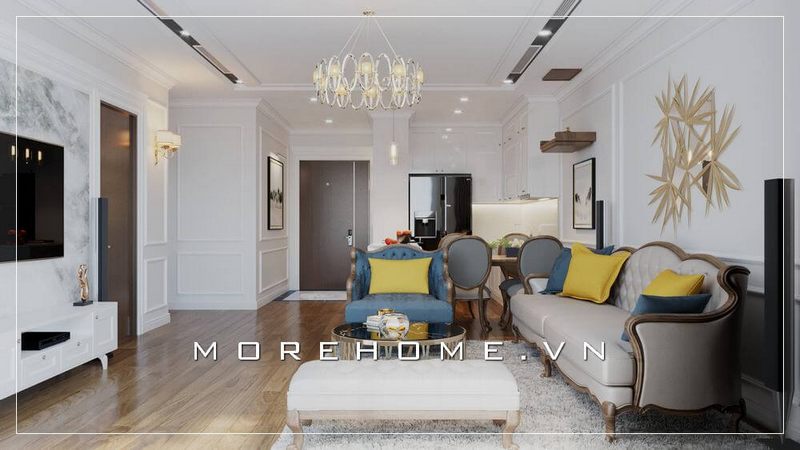 Mẫu sofa phòng khách tân cổ điển sang trọng với tone màu vàng kem thể hiện sự tinh tế và đẳng cấp của gia chủ