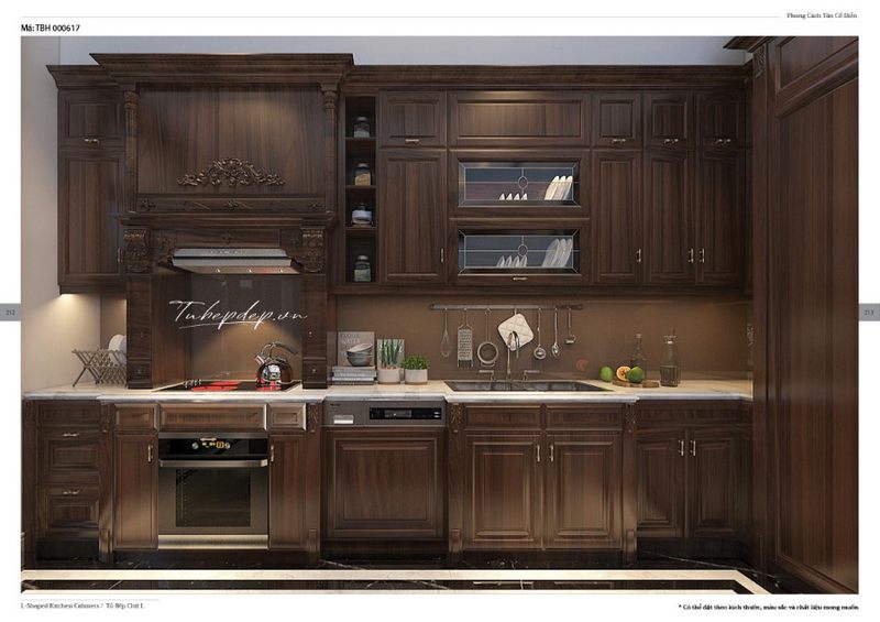 Mẫu tủ bếp gỗ óc chó nâu đẳng cấp được thiết kế tỉ mỉ, kì công với các họa tiết chạm trổ đầy nghệ thuật phù hợp cả cho chung cư, biệt thự hay nhà phố
