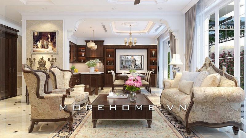 Phòng khách biệt thự, nhà phố đầy sang trọng với tâm điểm là bộ sofa tân cổ điển từ gỗ óc chó cao cấp kiểu dáng văng tiện lợi.