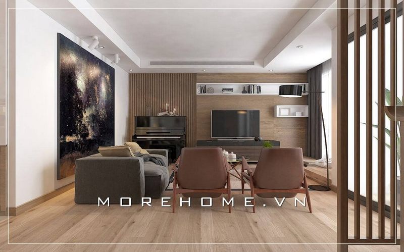 Ấn tượng với thiết kế nội thất phòng khách chung cư đơn giản đa số từ chất liệu gỗ tự nhiên cảm giác gần gũi với thiên nhiên.