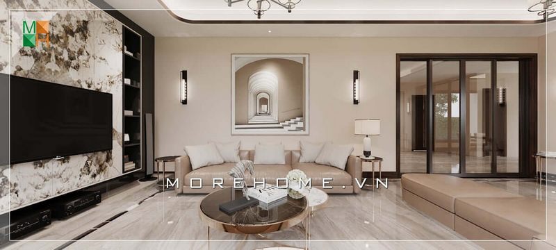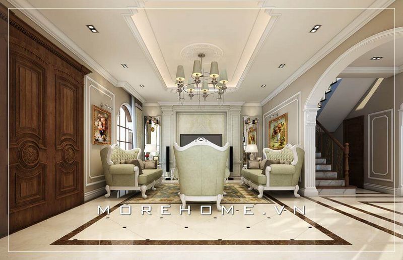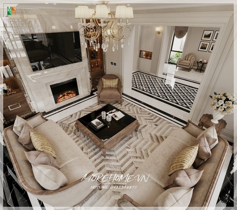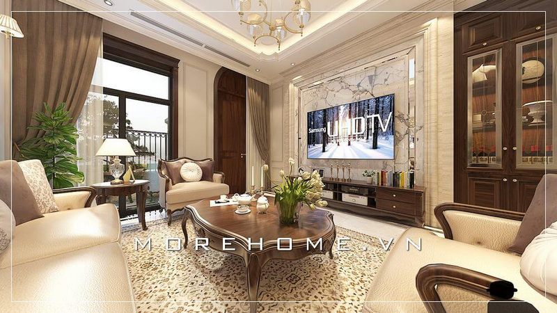 Thiết kế phòng khách biệt thự theo phong cách tân cổ điển góp phần tô điểm thêm giá trị thẩm mỹ cho không gian tổ ấm của gia đình.