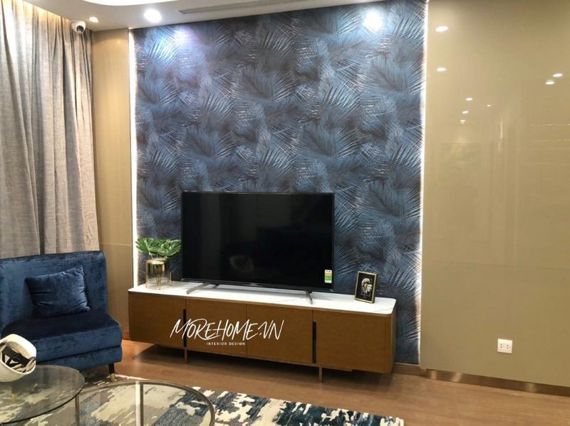 Kết hợp cùng đồ nội thất được sơn màu ghi giấy dán tường tone màu xanh khiến không gian phòng khách trở nên cực kỳ ấm áp