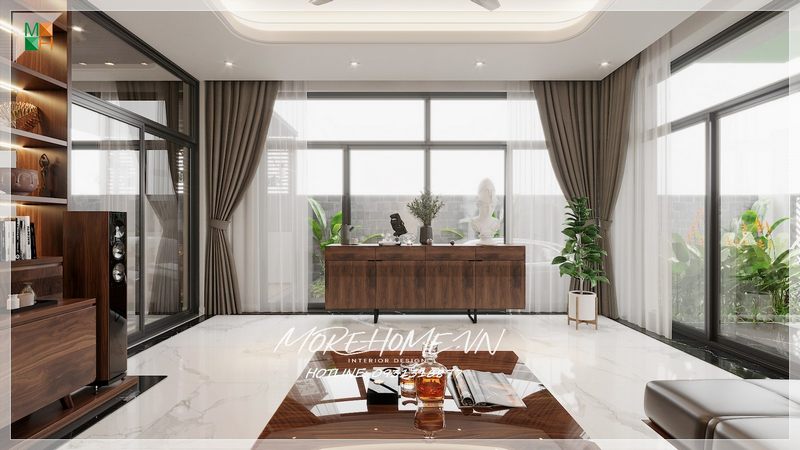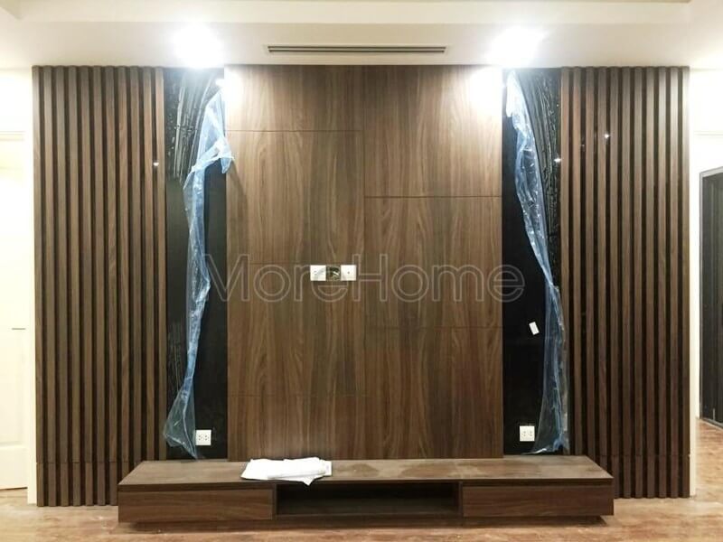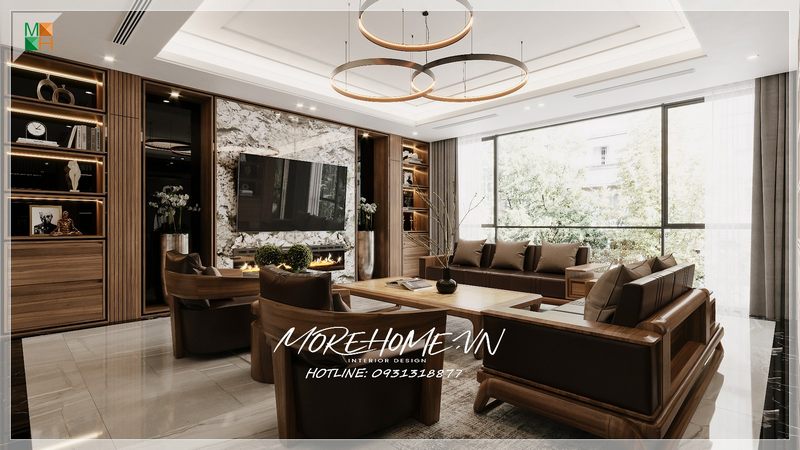 Morehome thi công hoàn thiện hệ tủ gỗ trang trí nội thất phòng khách biệt thự 4 tầng Nghệ An