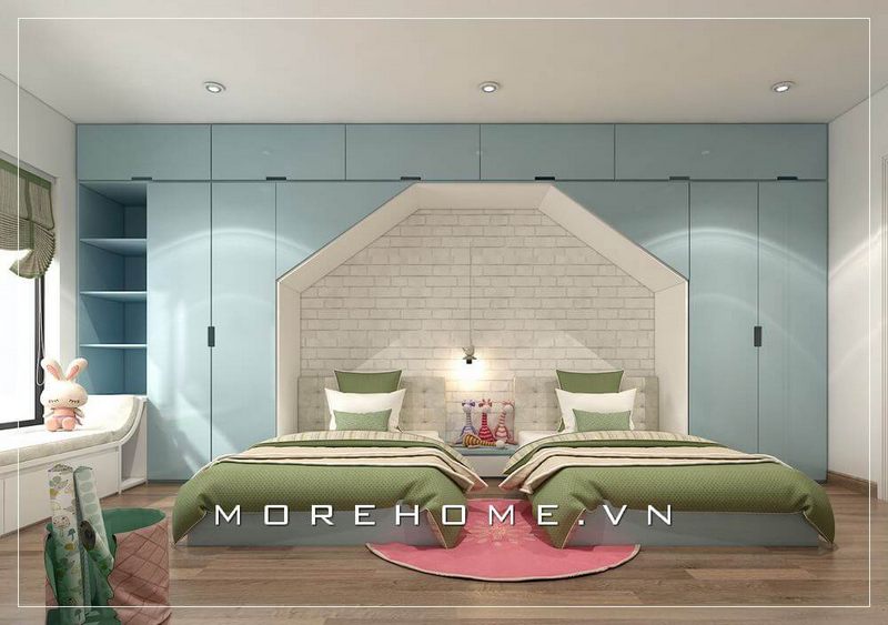 Thiết kế phòng ngủ trẻ em với tone màu xanh tạo cảm giác thanh thoát, nhẹ nhàng