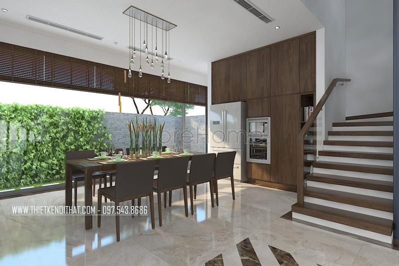 Mẫu thiết kế phòng ăn liền phòng bếp sang trọng, đẳng cấp cho biệt thự với hệ cửa kính ban công 4 cánh giúp mở rộng không gian căn phòng và lấy ánh sáng tự nhiên