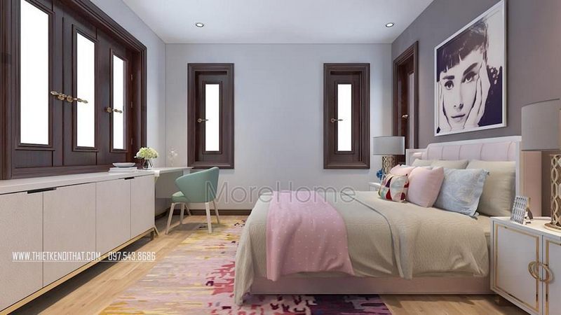 Các chi tiết trang trí tường được nhấn mạnh, khá nặng về thẩm mỹ từ đó mang đến cho gia chủ cảm giác nhẹ nhàng