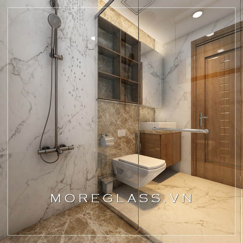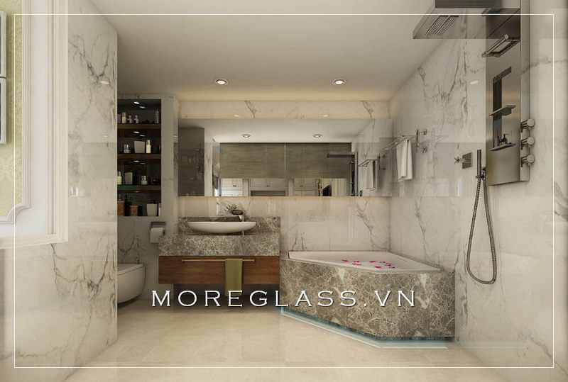 Vách tắm kính 180 độ giúp không gian trở nên hiện đại sang trọng, ngăn nước văng sang khu vực khác trong phòng gây ướt át khó chịu.