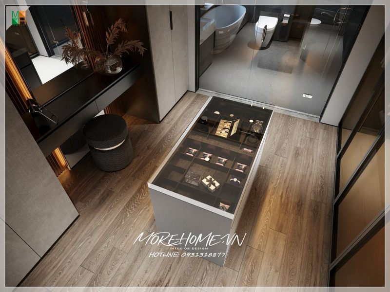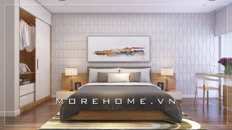 Để tạo nên một phòng ngủ hiện đại cho các căn hộ, nhà phố và biệt thự, gợi ý thiết kế sử dụng gỗ công nghiệp phong cách hiện đại để thay thế phòng để đồ.