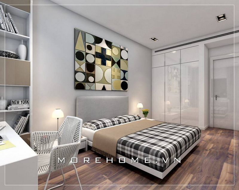 Giường ngủ chung cư hiện đại có kiểu dáng thấp tiện dụng, mảng đầu giường bọc nỉ tạo ra một điểm nhấn ấn tượng, làm cho căn phòng trở nên êm ái, nhẹ nhàng hơn.