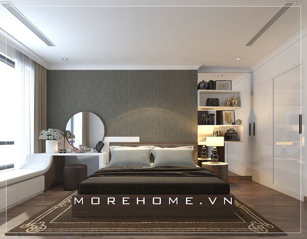 Bố trí nội thất phòng ngủ chung cư khoa học và hợp lý, chiếc giường ngủ hiện đại, đơn giản với chất liệu gỗ công nghiệp tạo nên cho không gian phòng ngủ thêm thoáng rộng hơn